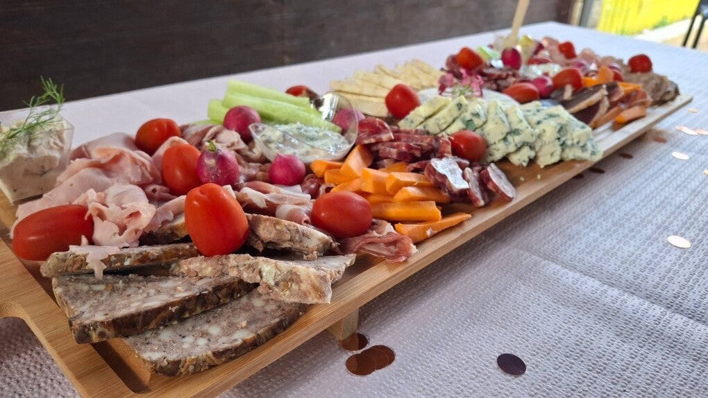 Jambon de pays, saucisse séchée, chiffonnade de jambon blanc, fricandeaux, magret séché fait maison, Roquefort, Pérail, Laguiole, crudités et pain artisanal.